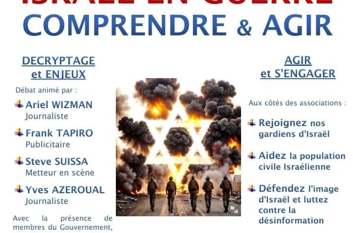 Venez à la soirée « Israël en Guerre – comprendre et agir » que nous organisons à Paris jeudi 26 octobre. Venez participer à l’effort de guerre selon vos possibilités et prouver à nos ennemis que: