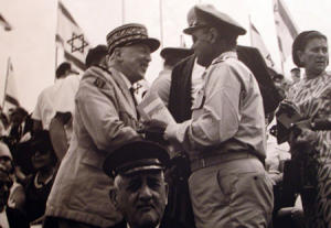Il marque quelque étonnement de voir ces juifs combattre sous les couleurs de l’Union Jack. « Il ne nous est pas permis de combattre sous les plis de notre drapeau… Le règlement s’y oppose… », Répond Liebmann. « Le règlement britannique, s’écrie Koenig, ici je m’en moque. Vous êtes avec des Français, nous sommes victorieux tous les deux. » Aussitôt, un soldat juif s’empresse de déployer le fanion soigneusement conservé, le fanion blanc frappé en bleu de l’étoile de David. Aux officiers qui l’entourent, le commandant Pierre Kœnig ordonne a la 1ère brigade française libre : « Le drapeau juif, messieurs, saluez ! » et la Tikva retentit en plein désert de Lybie.